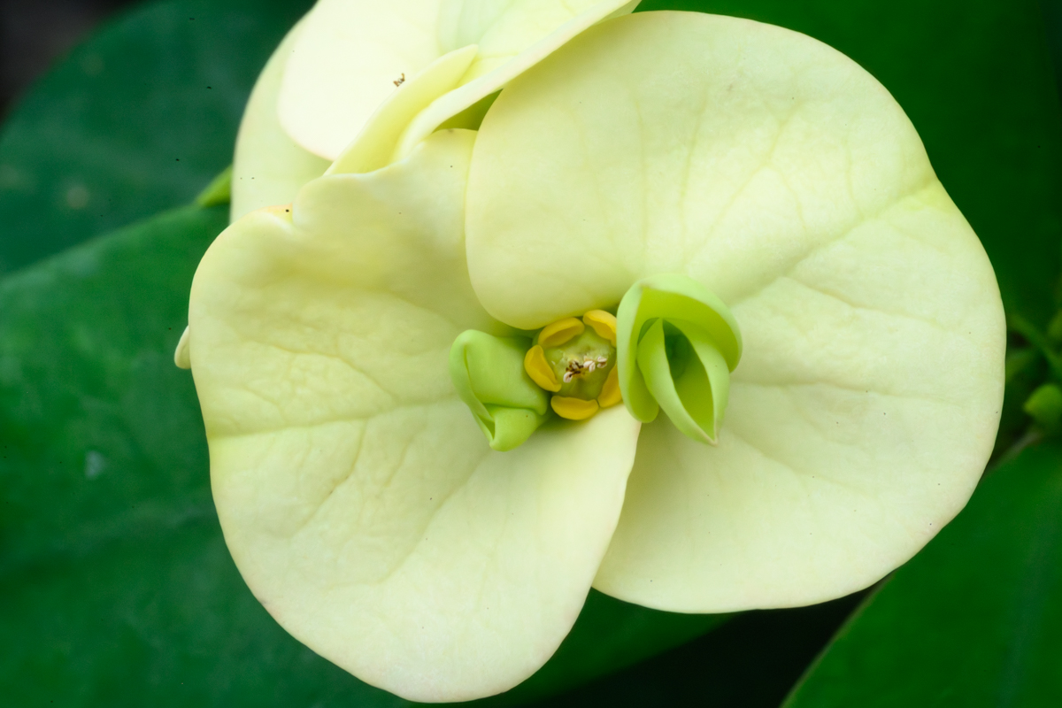 I came across the tiniest of details in a blossom at Whitcomb Conservatory in Belle Isle. What looks like a flower within a flower was spotted on the bloom of a yellow Crown of Thorns.